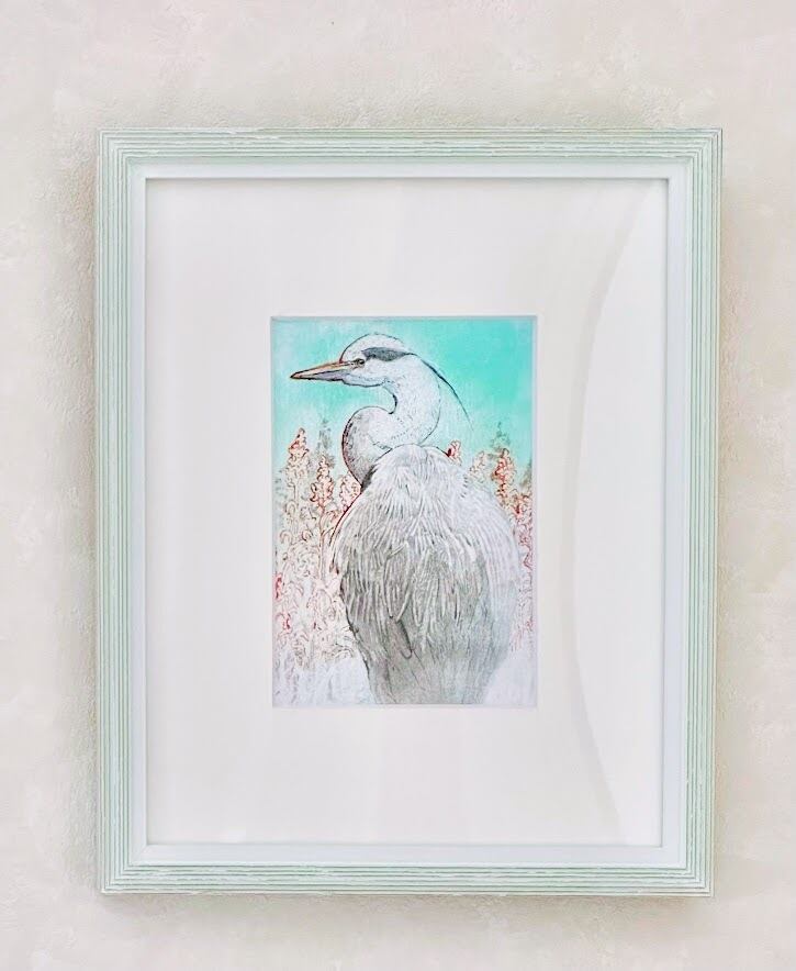 落ち着いた色調の中に、鷺の凛とした佇まいが静謐な美を放ち、見る人の心に穏やかな余韻を残します。