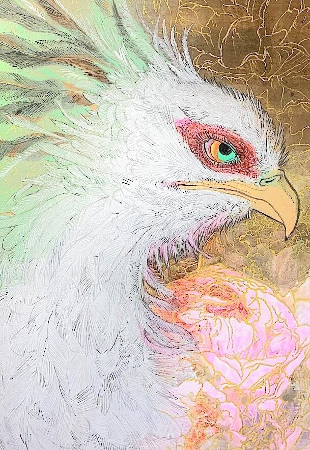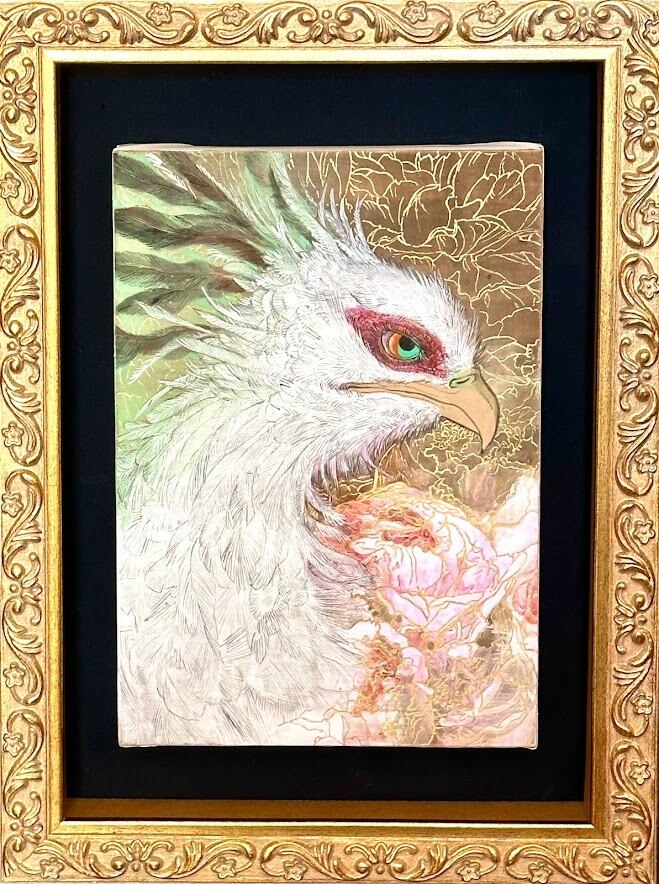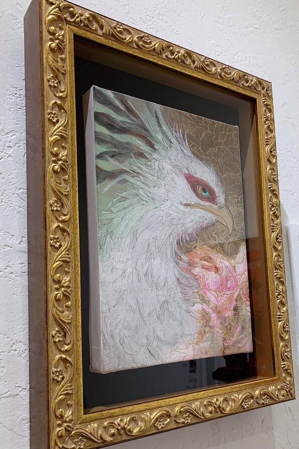 このサムホールサイズの日本画は、緻密な筆遣いで鷲の気高さと生命力を表現しています。